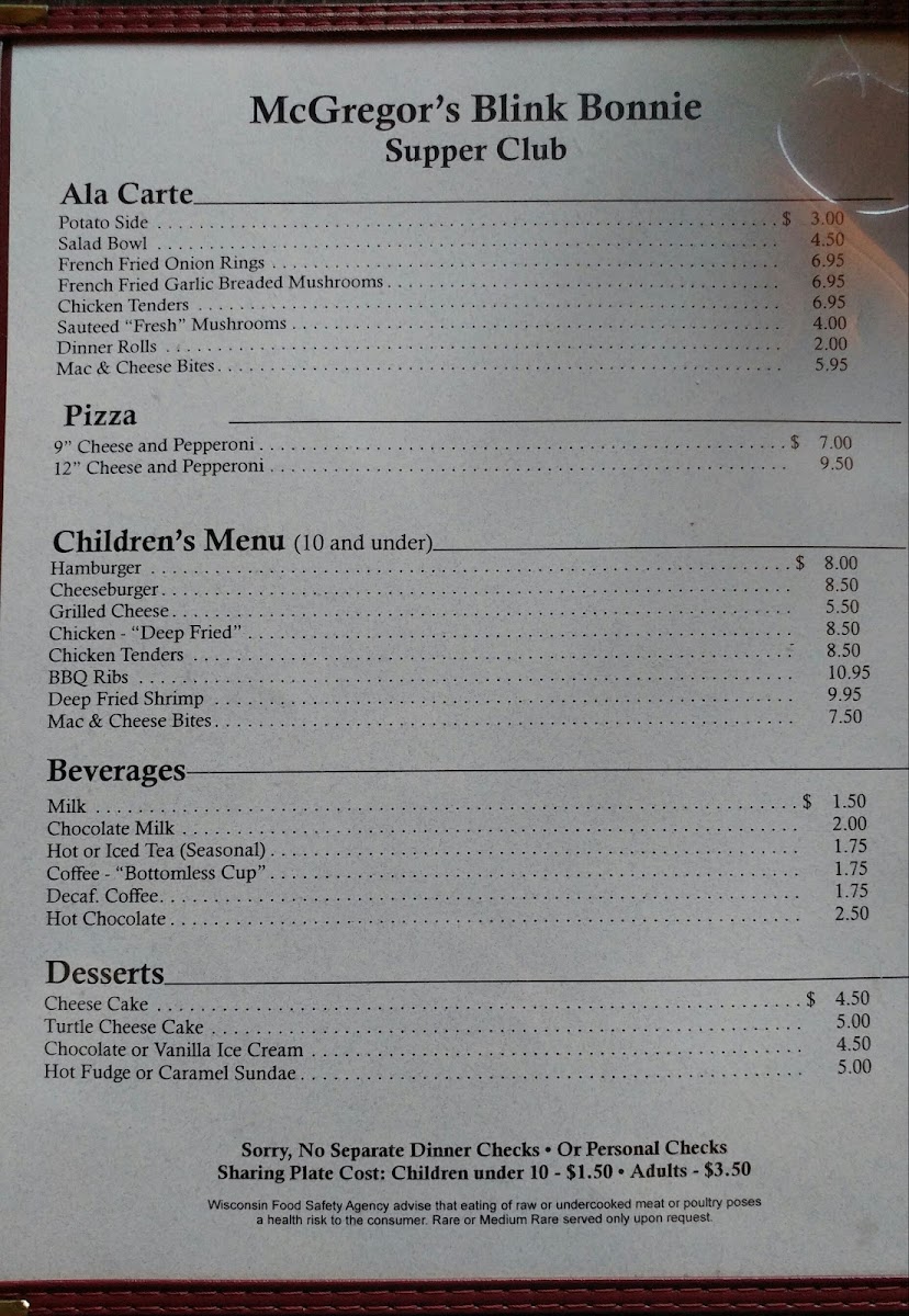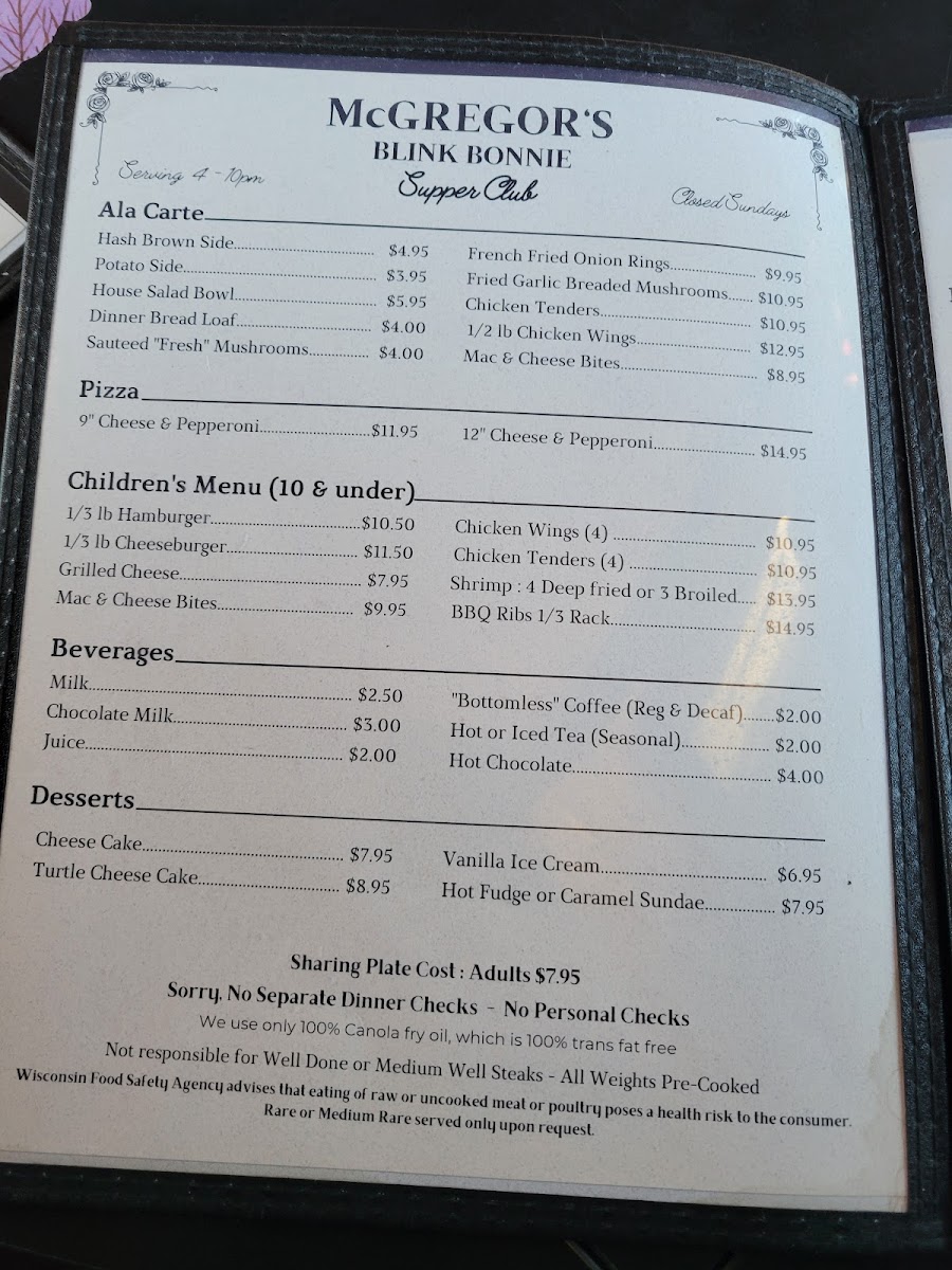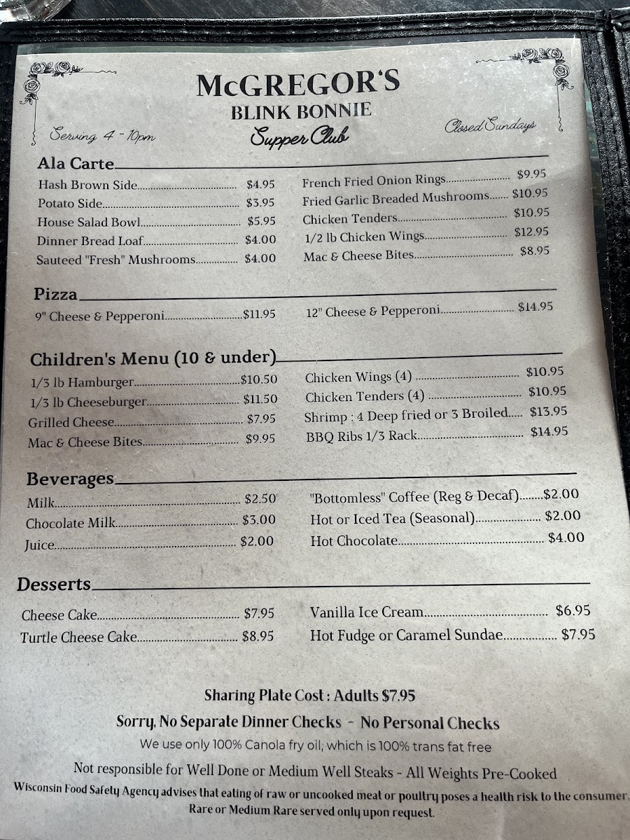 Welcome to McGregor's Blink Bonnie Supper Club, where culinary magic unfolds right in the heart of St Germain, WI! Our menu is a celebration of flavor and comfort, featuring tantalizing specialties that will have your taste buds dancing. Start your evening with our signature Whiskey Old Fashioned Sour or a classic Brandy Old Fashioned, then dive into a symphony of seafood with our Shrimp and Scallops dish. For the meat lovers, the 10oz Filet Mignon and the mouth-watering 20 oz T Bone Steak are sure to impress, perfectly paired with our crispy steak fries. Don’t miss out on our delightful desserts like the rich Turtle Cheesecake and decadent Lava Cake, perfect for ending your meal on a sweet note. At McGregor's Blink Bonnie, every dish is crafted to ensure a memorable dining experience. Join us at 1506 Jerry Rd and treat yourself to an unforgettable supper that highlights the best of classic American fare!