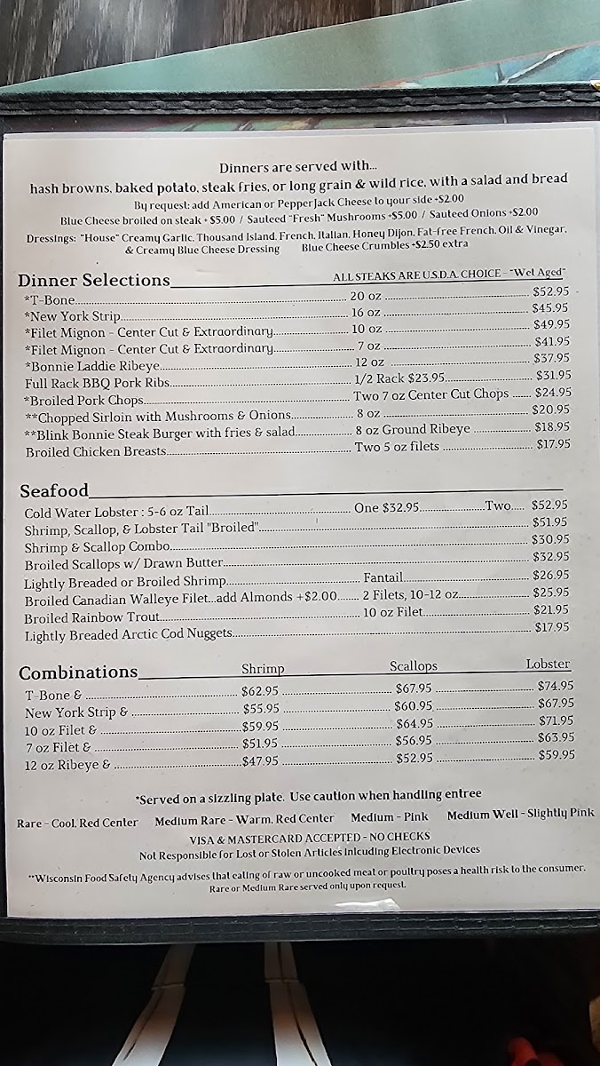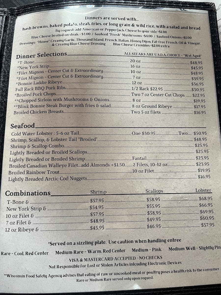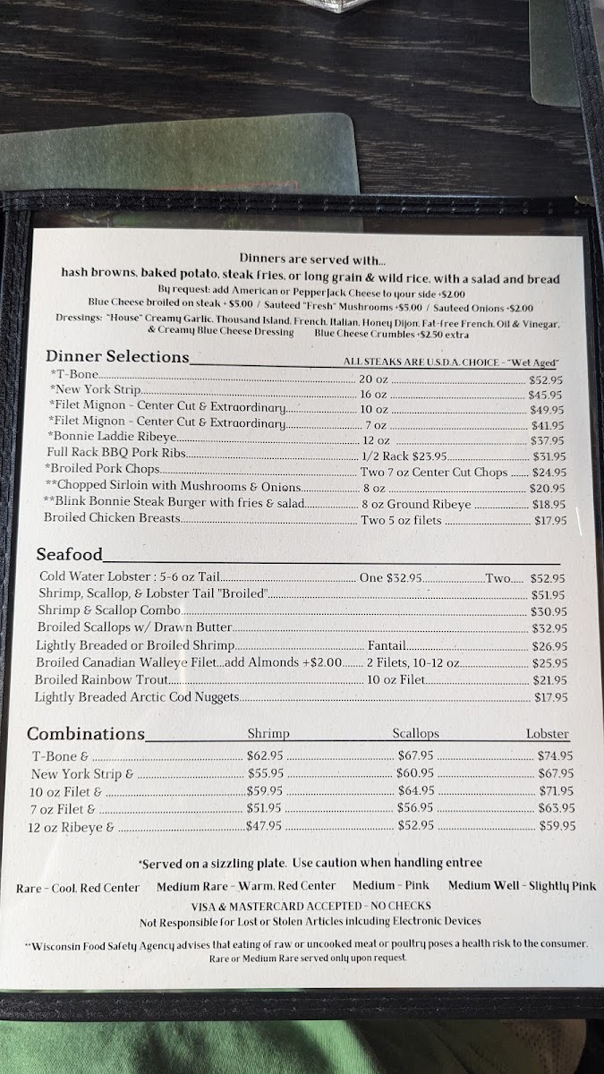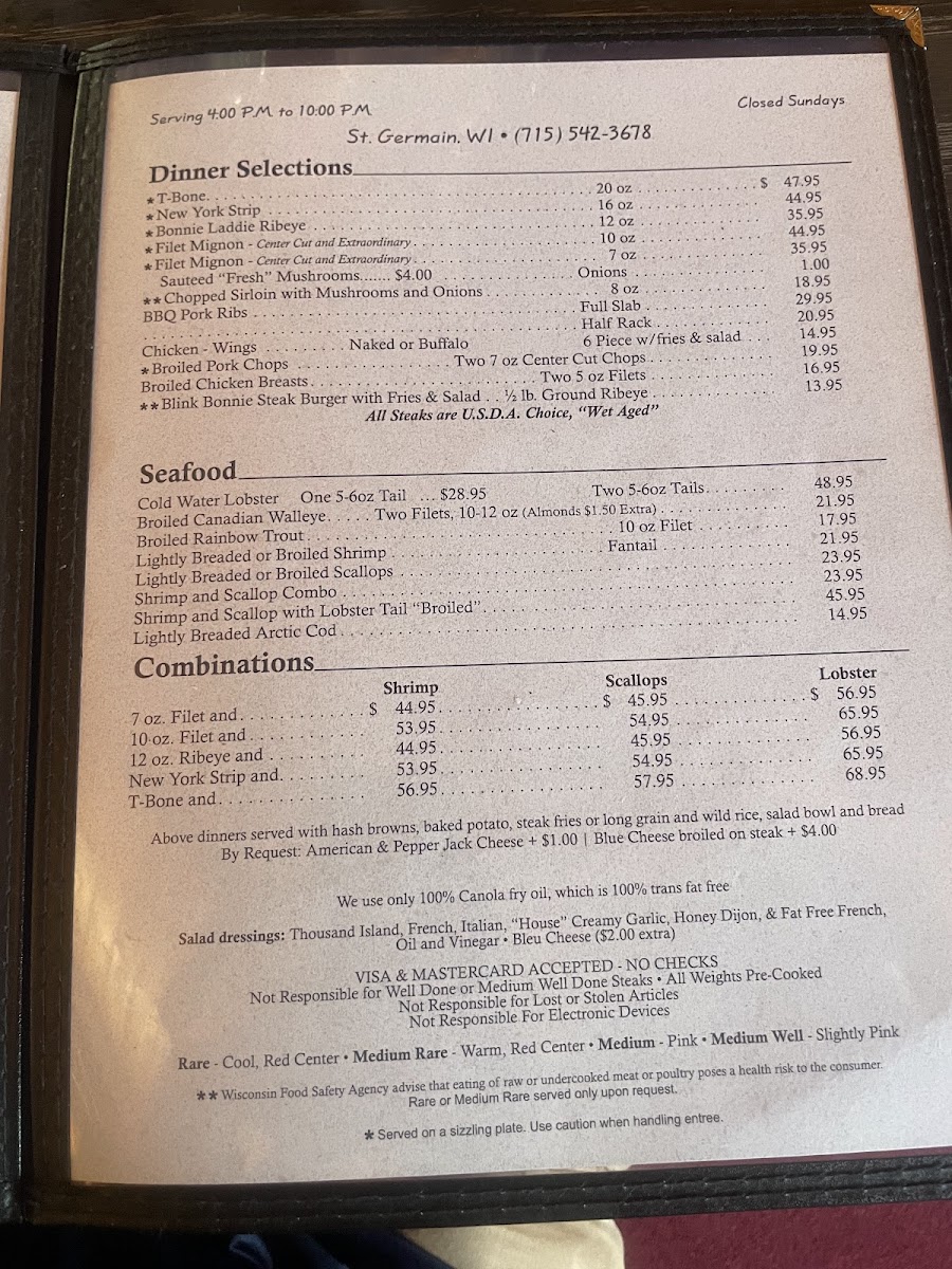 Welcome to McGregor's Blink Bonnie Supper Club, where culinary magic unfolds right in the heart of St Germain, WI! Our menu is a celebration of flavor and comfort, featuring tantalizing specialties that will have your taste buds dancing. Start your evening with our signature Whiskey Old Fashioned Sour or a classic Brandy Old Fashioned, then dive into a symphony of seafood with our Shrimp and Scallops dish. For the meat lovers, the 10oz Filet Mignon and the mouth-watering 20 oz T Bone Steak are sure to impress, perfectly paired with our crispy steak fries. Don’t miss out on our delightful desserts like the rich Turtle Cheesecake and decadent Lava Cake, perfect for ending your meal on a sweet note. At McGregor's Blink Bonnie, every dish is crafted to ensure a memorable dining experience. Join us at 1506 Jerry Rd and treat yourself to an unforgettable supper that highlights the best of classic American fare!
